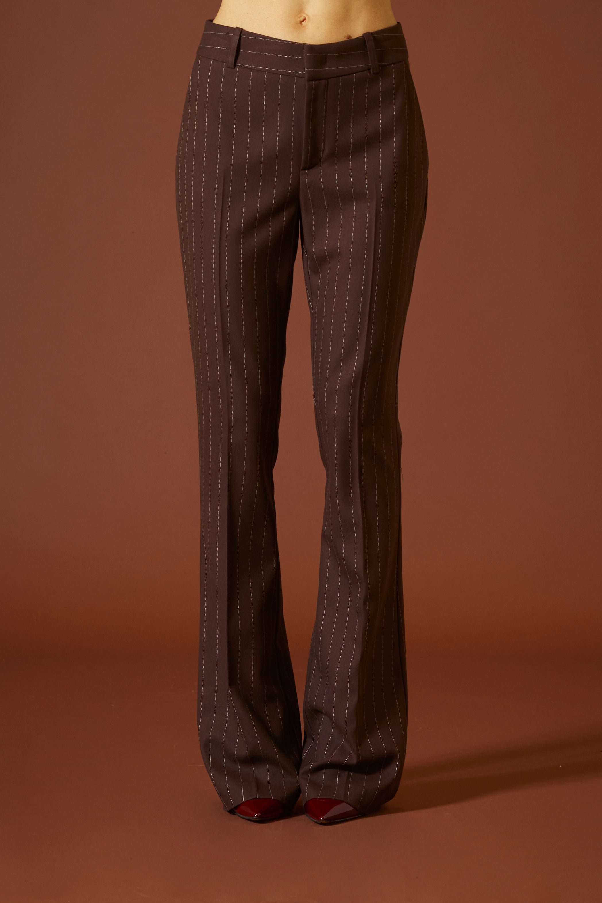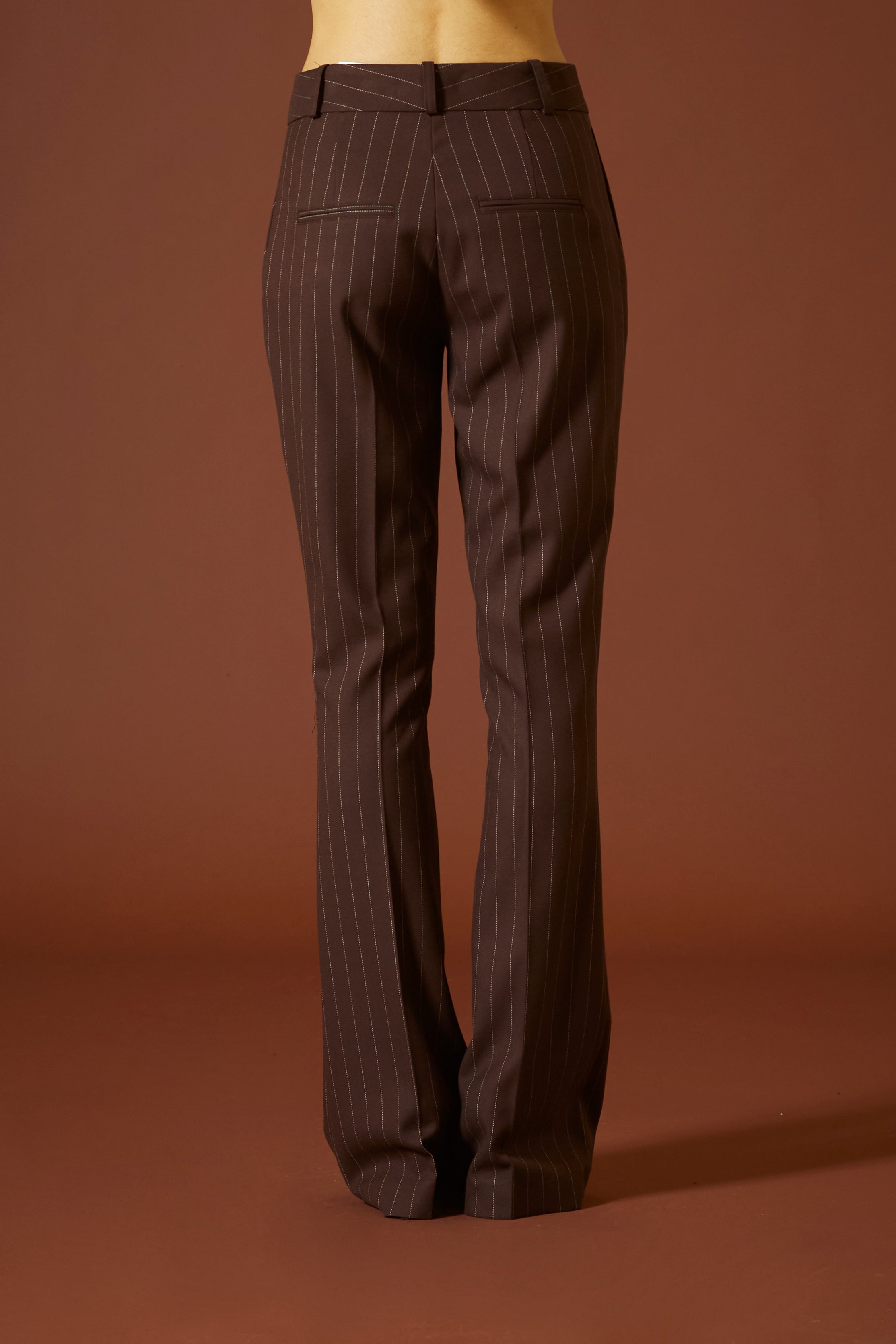 La vita alta e aderente scolpisce il punto vita, mentre la gamba che si apre gradualmente a zampa accompagna il movimento con un’eleganza naturale, creando un effetto dinamico e sofisticato. Il taglio impeccabile e la cura dei dettagli rendono questo pantalone perfetto per slanciare la figura e valorizzare ogni forma.