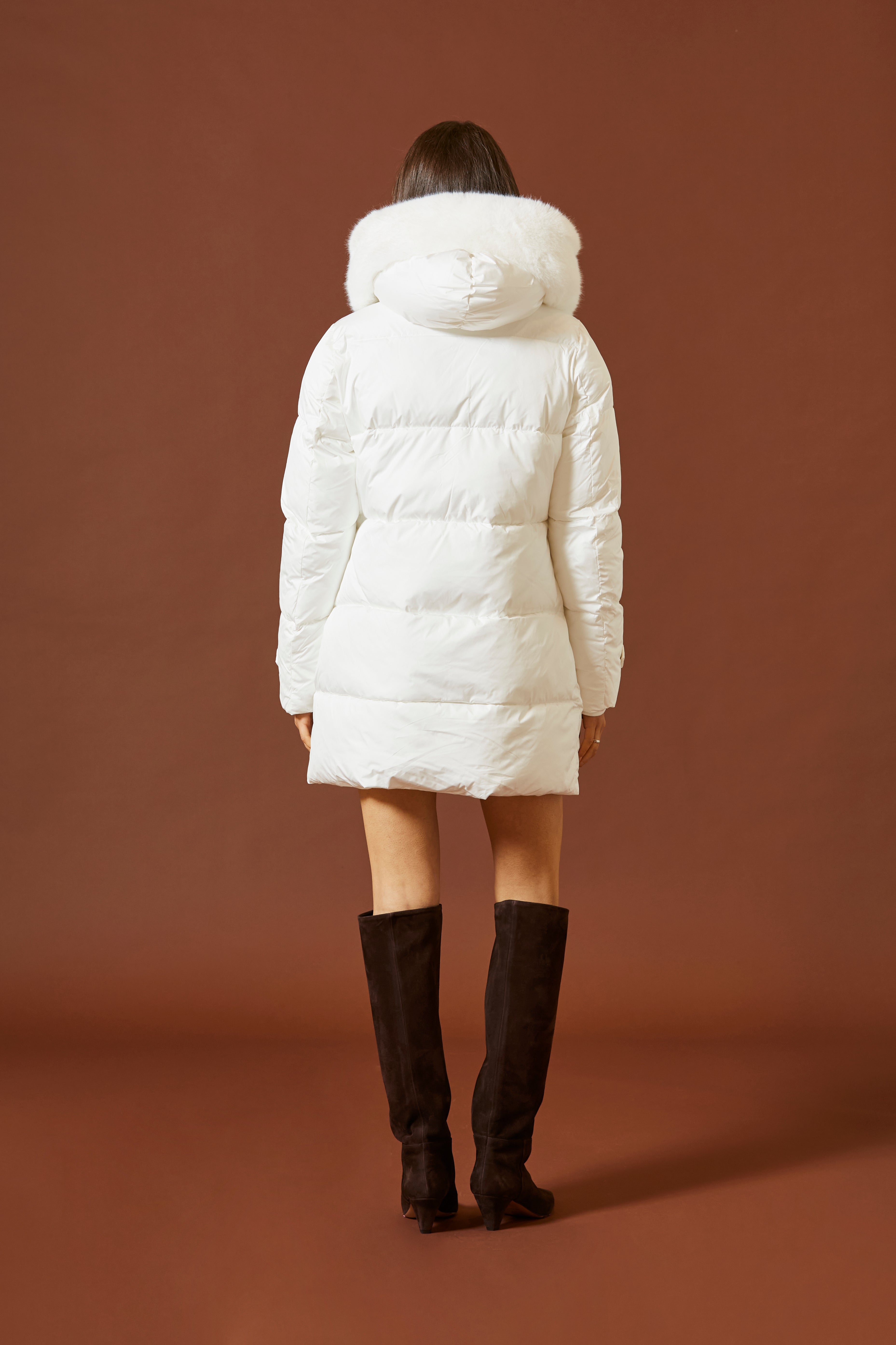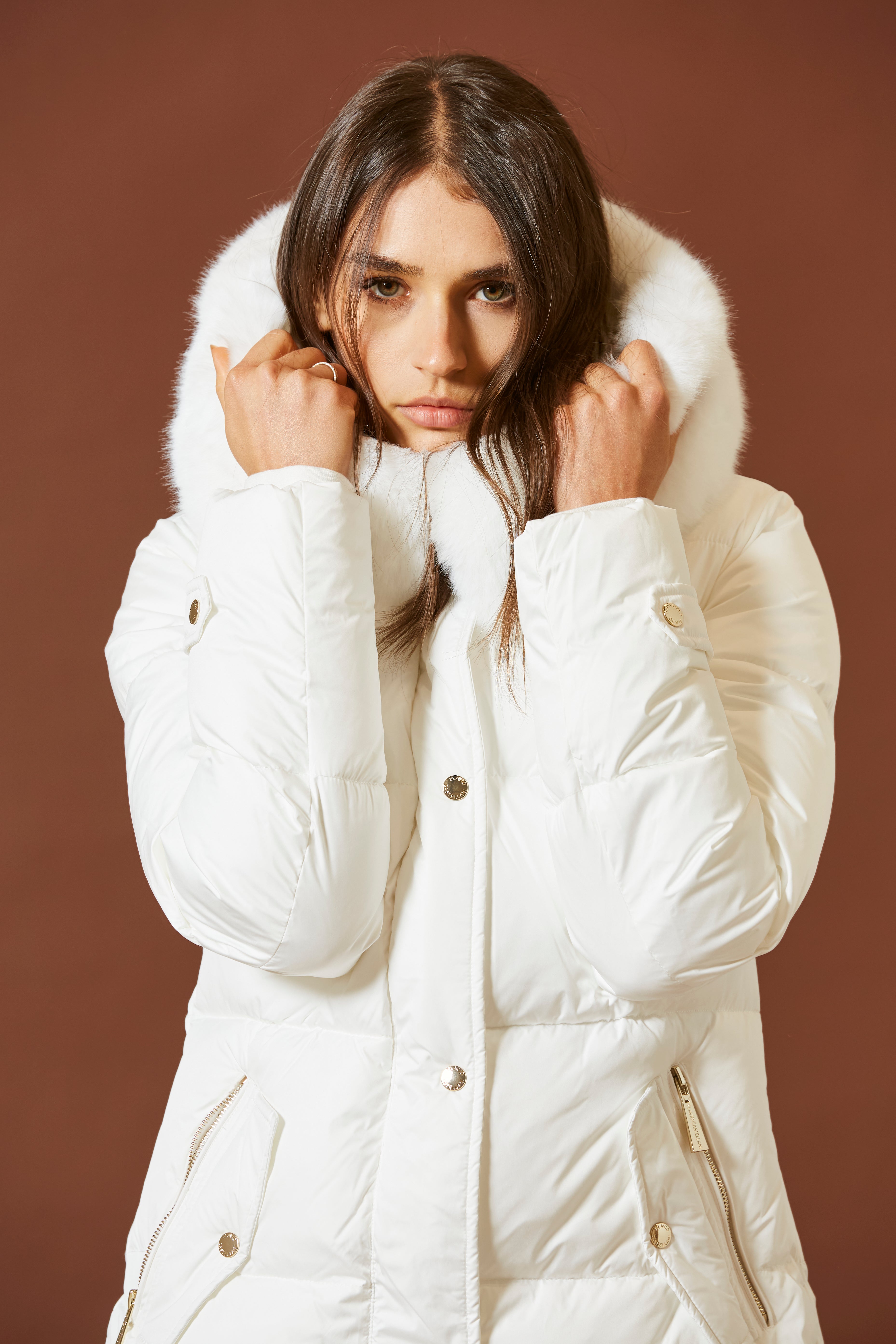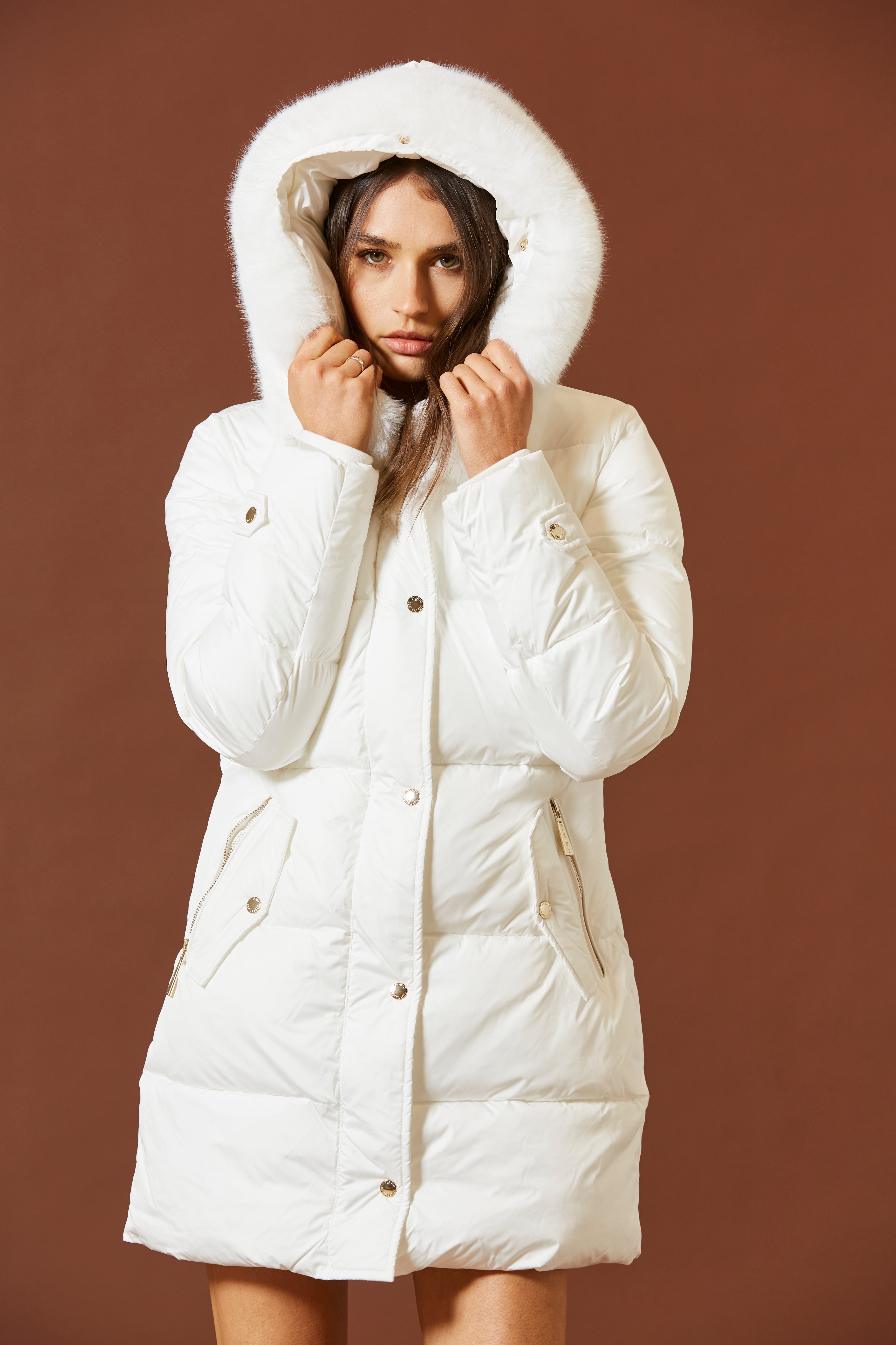 È il piumino con ecopelliccia sul cappuccio, impreziosito da bottoni e zip oro — un perfetto equilibrio tra funzionalità e raffinatezza, tra comfort e femminilità urbana.
