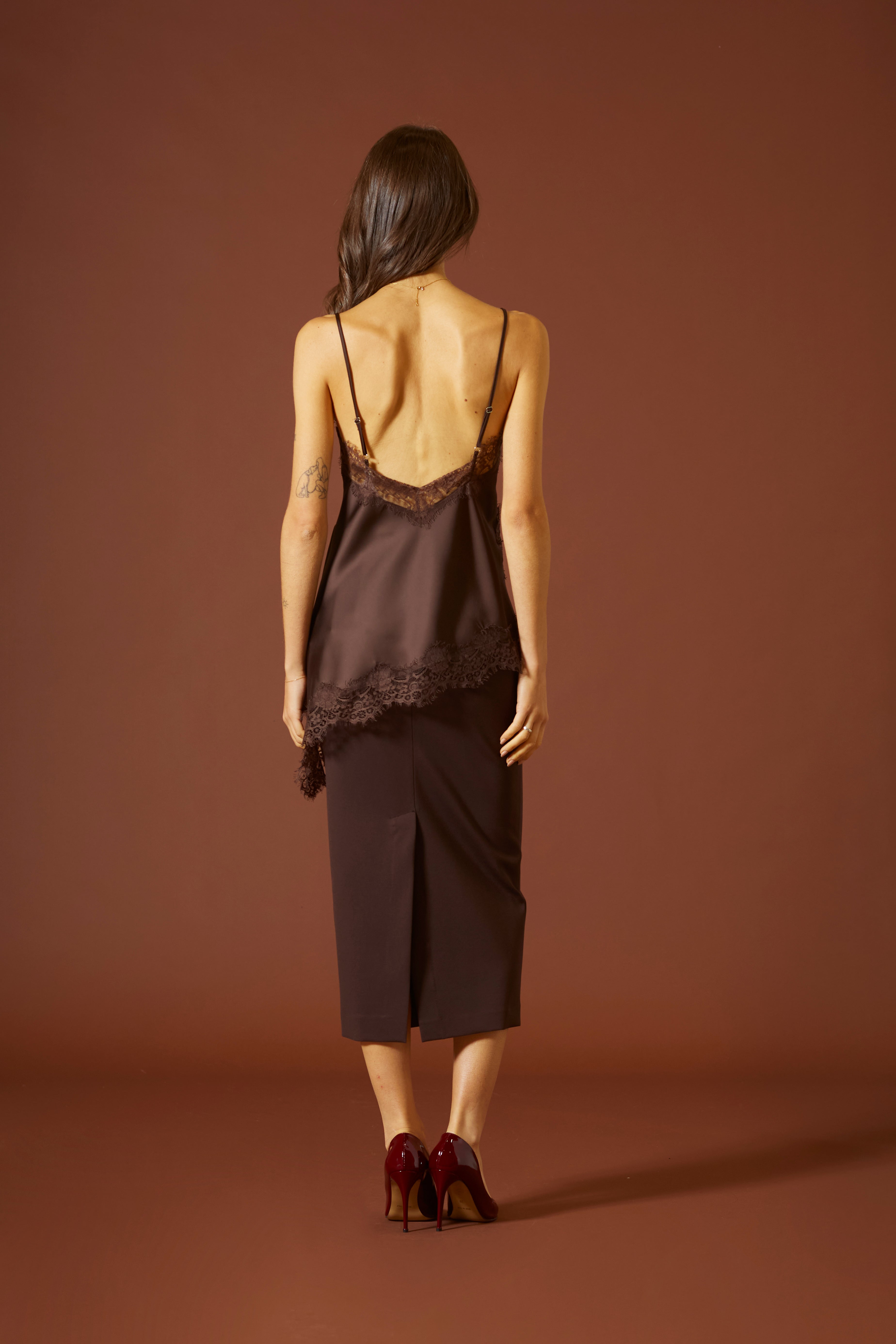 Il tessuto fluido e setoso, con il suo tocco vellutato, avvolgeva la figura con la delicatezza di un petalo. Seguiva ogni movimento con un’eleganza naturale, lasciando che la luce scivolasse sulle spalle e sul décolleté come un riflesso d’acqua. Al bordo, il pizzo raffinato — fine, romantico, impalpabile — disegnava arabeschi sulla pelle, accennando senza mai rivelare, suggerendo più di quanto mostrasse.
